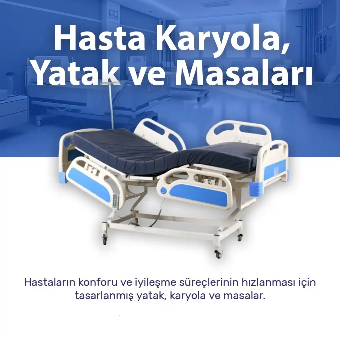 - Hasta Karyolaları:Hasta karyolaları, hastaların yatışlarını kolaylaştıran, ayarlanabilir ve motorlu özelliklere sahip ürünlerdir. Bu karyolalar, hem hasta hem de sağlık çalışanları için işlevsel özellikler sunar. Baş, ayak ve yükseklik ayarı yapılabilen karyolalar, hastaların yatarken konforlu bir pozisyonda kalmalarını sağlar. Aynı zamanda hastaların fiziksel ihtiyaçlarına göre kolayca ayarlanabilir.