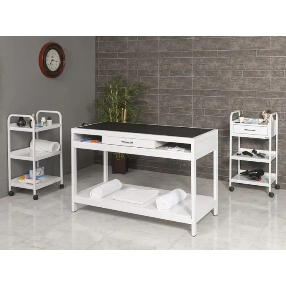 Veteriner pet bakım ve muayene masası, kauçuk kaplı üst yüzeyi ile kaymayı engelleyerek güvenli kullanım sunar. MDF üzerine döşenen kauçuk yüzey dayanıklı ve kolay temizlenebilir bir yapı sağlar. Ahşap raf ve çekmece bölümü, malzemelerin düzenli ve kolay erişilebilir şekilde saklanmasına imkân tanır. Sabit ayaklı ve yüksek ağırlık taşıyabilen yapısı, klinik ortamında stabil çalışma sağlar. Kullanım dışı zamanlarda çıkarılabilen ayarlanabilir kromajlı “H” barı ile işlevsellik artırılmıştır.
