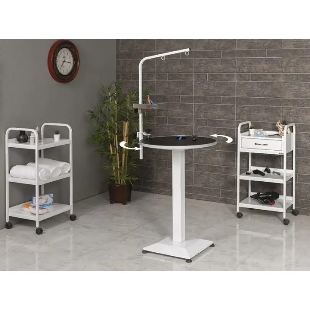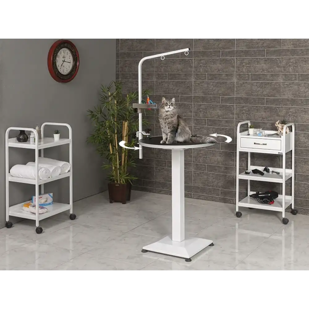 Veteriner pet bakım ve muayene masası, kauçuk kaplama üst tablası sayesinde kaymayı engelleyerek güvenli bir çalışma alanı sağlar. MDF ahşap üzerine döşenen kauçuk yüzeyi kolay temizlenebilir yapı sunarken, 360 derece dönebilmesi işlem sırasında erişimi kolaylaştırır. Sabit ayaklı tasarımı geniş ve kalın sac alt tabla ile desteklenmiş olup devrilmeye karşı yüksek dayanım sağlar. Çıkarılabilir kromajlı bar kullanım dışı durumlarda kolayca sökülebilir yapıya sahiptir.